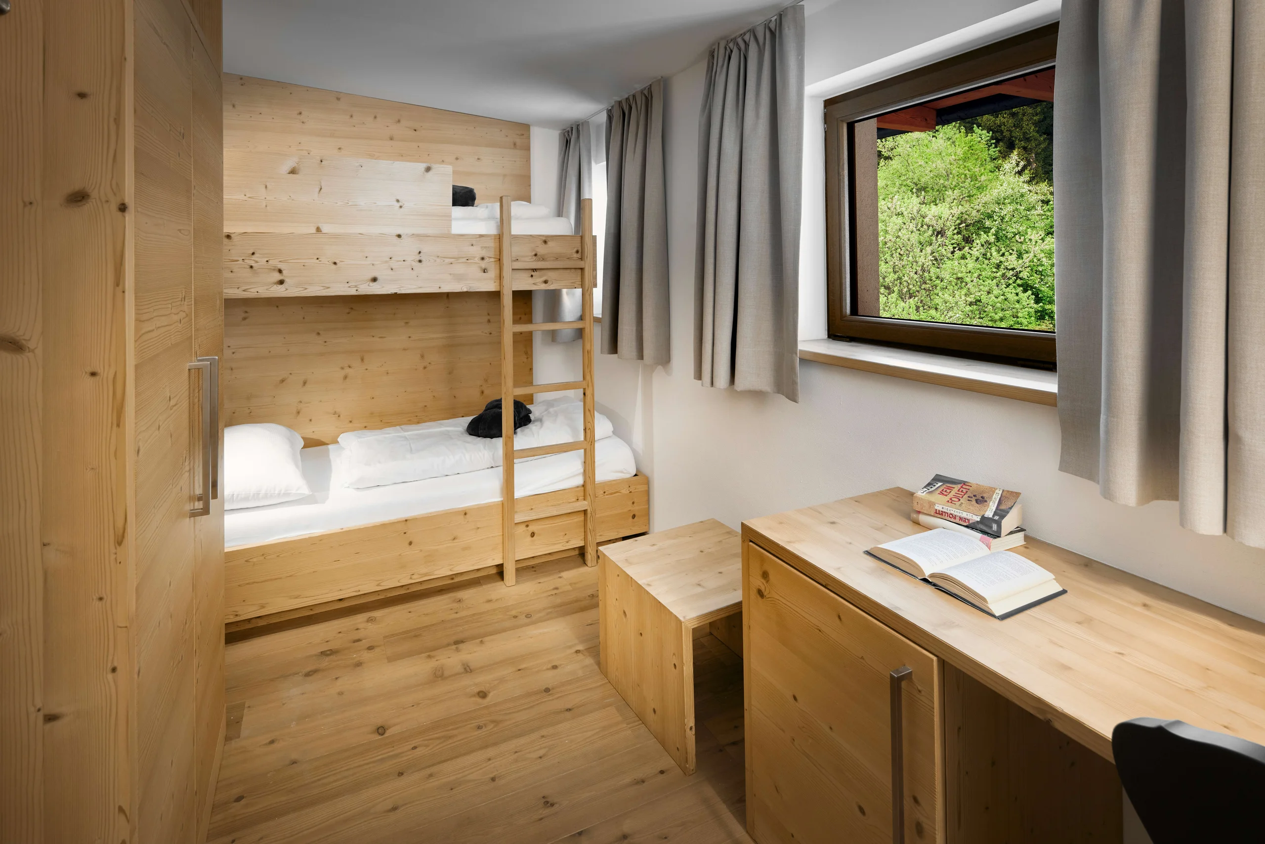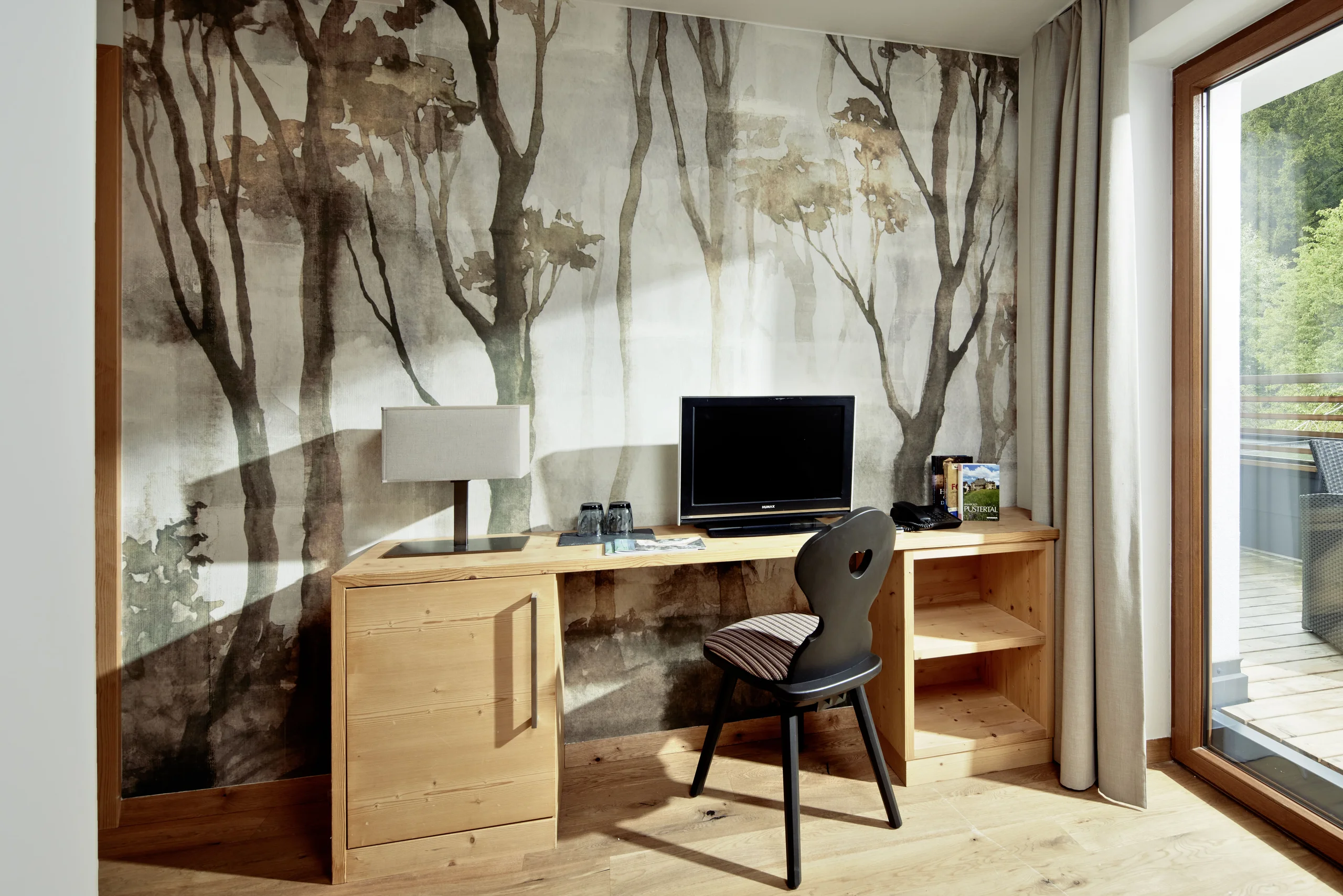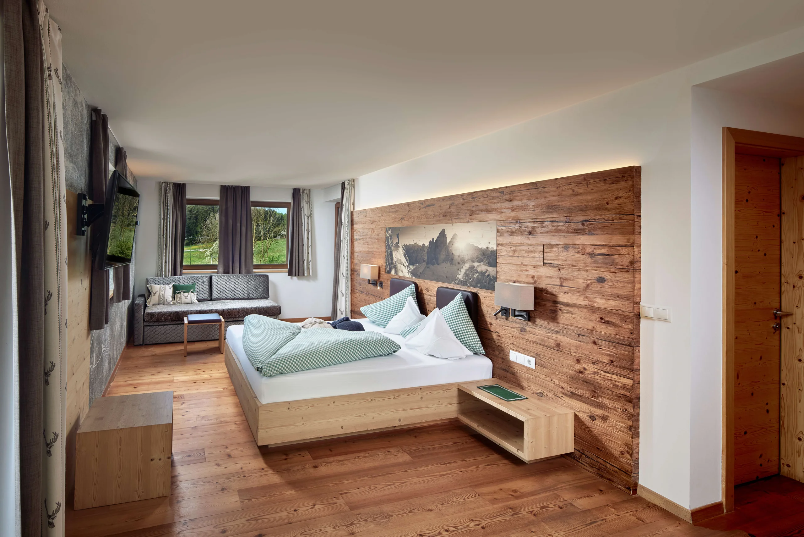 Neues Wohlfühl Suite 50 m² in massivem Naturholz mit separatem Kinderzimmer und Wohnraum. Die Suite ist in warmen Naturfarben gehalten und verfügt über eine komfortable Ausstattung: Sofa, Balkon mit Waldblick, 42" Flat-TV mit über 70 Kanälen inklusive Radio, WLAN, Kühlbox, Tresor für Ihre Wertsachen. Außerdem dürfen Sie sich auf ein schönes, großes Badezimmer mit Dusche, Föhn, Schminkspiegel, Badetasche mit Badetuch, Badeschlappen und kuscheligem Bademantel freuen. Das außergewöhnliche Die-Waldruhe-Design schafft eine unverwechselbare Atmosphäre in der Family Suite deluxe.
